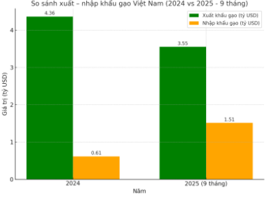 Biểu đồ so sánh xuất nhập gạo 2024 – 2025 ( Ảnh: FBNV )