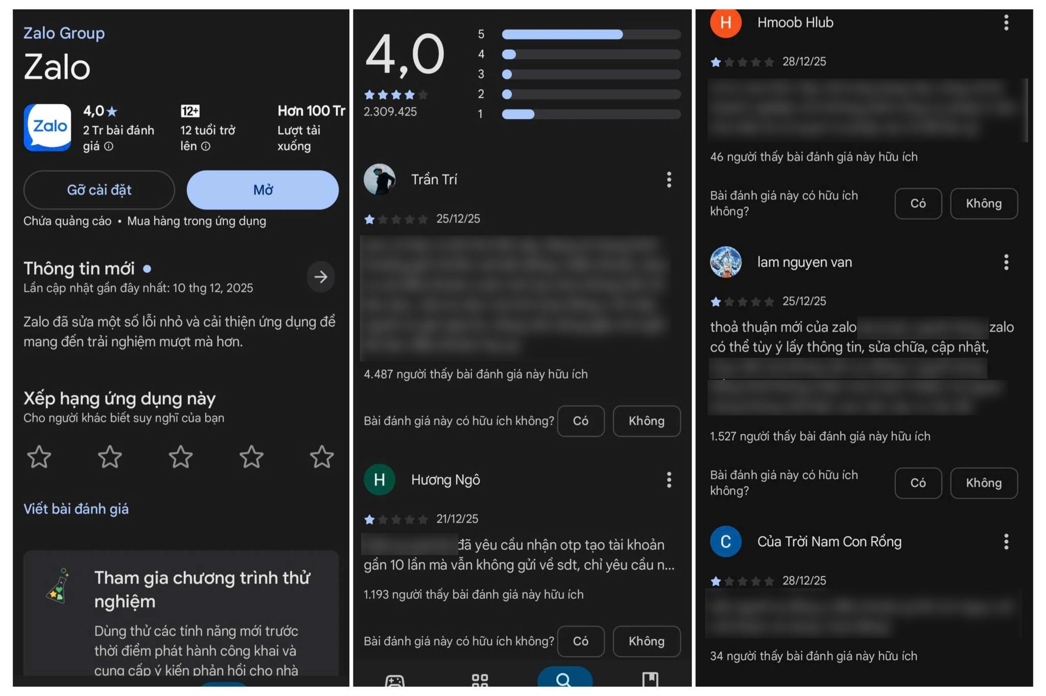 Bên cạnh đó, trên CH Play, tình trạng tương tự cũng diễn ra khi hàng loạt người dùng đồng loạt để lại đánh giá 1 sao kèm theo nhận xét “không tốt”, “không minh bạch” hoặc “xâm phạm quyền riêng tư”. Một số ý kiến cho rằng điều khoản mới của Zalo chưa giải thích cụ thể mục đích sử dụng dữ liệu, thời gian lưu trữ cũng như phạm vi chia sẻ thông tin với bên thứ ba.